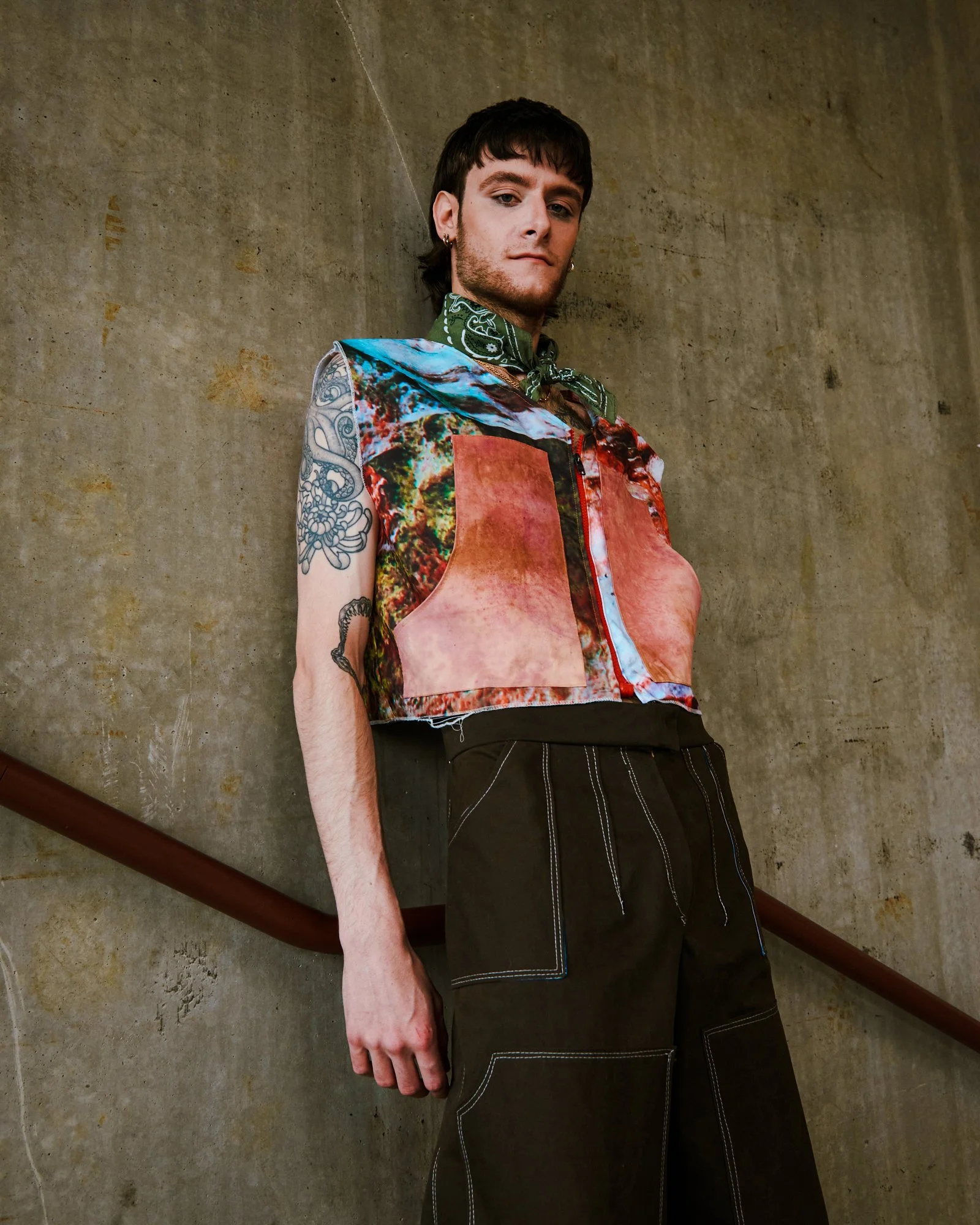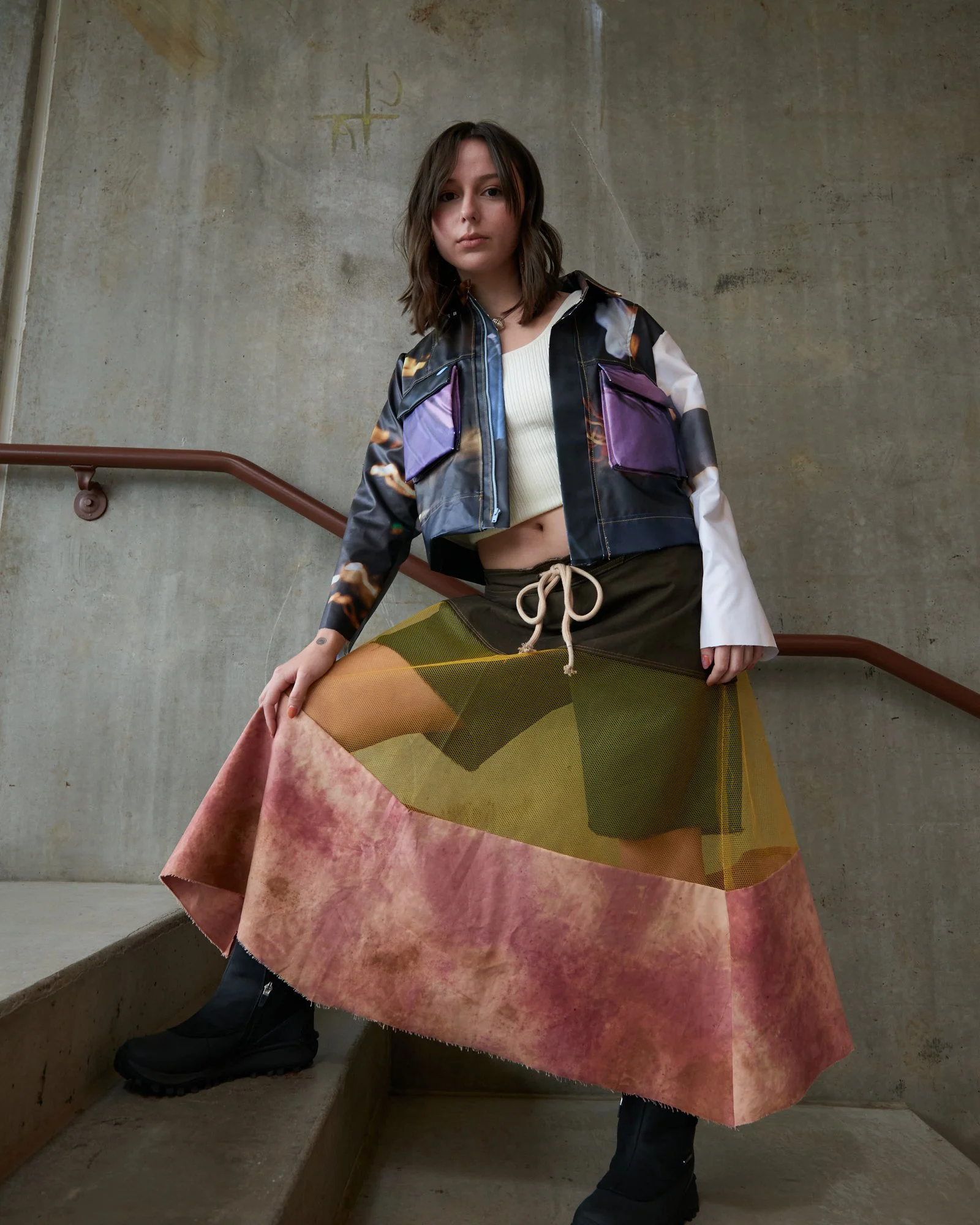 Community, a construct of connecting each other through common goals, geographical boundaries and circumstances. When individuals of our community are undermined, how do we create change as a community? 10% of the United States is known to have a physical disability, but 99% of the fashion industry does not pertain to adaptive wear. My collection uses fashion to close the gaps within our community as people. Being from the Midwest, I take a lot of inspiration from the blue-collar and growing small businesses. I’ll hold the door open because no one is a stranger, so we shouldn’t treat disabilities like one either. HYTCH-HKR is constructed with up-cycled banners, waste fabric from companies, and locally sourced natural dyes. I hope my collection will inspire you to be more conscious of your community too.